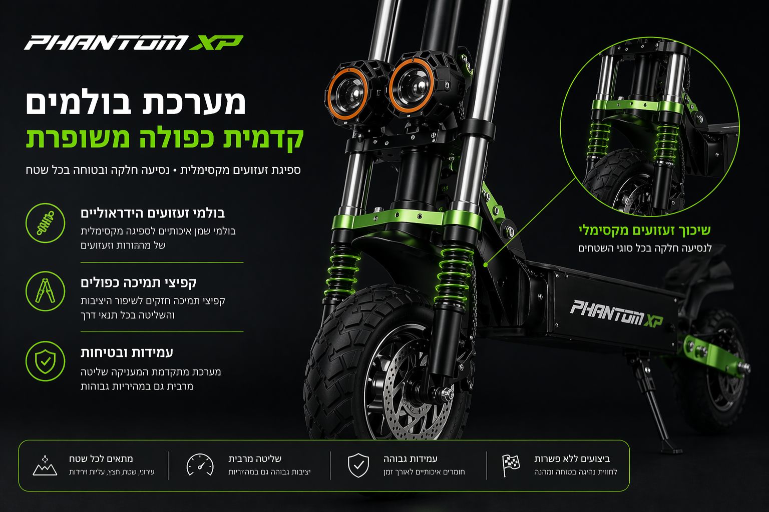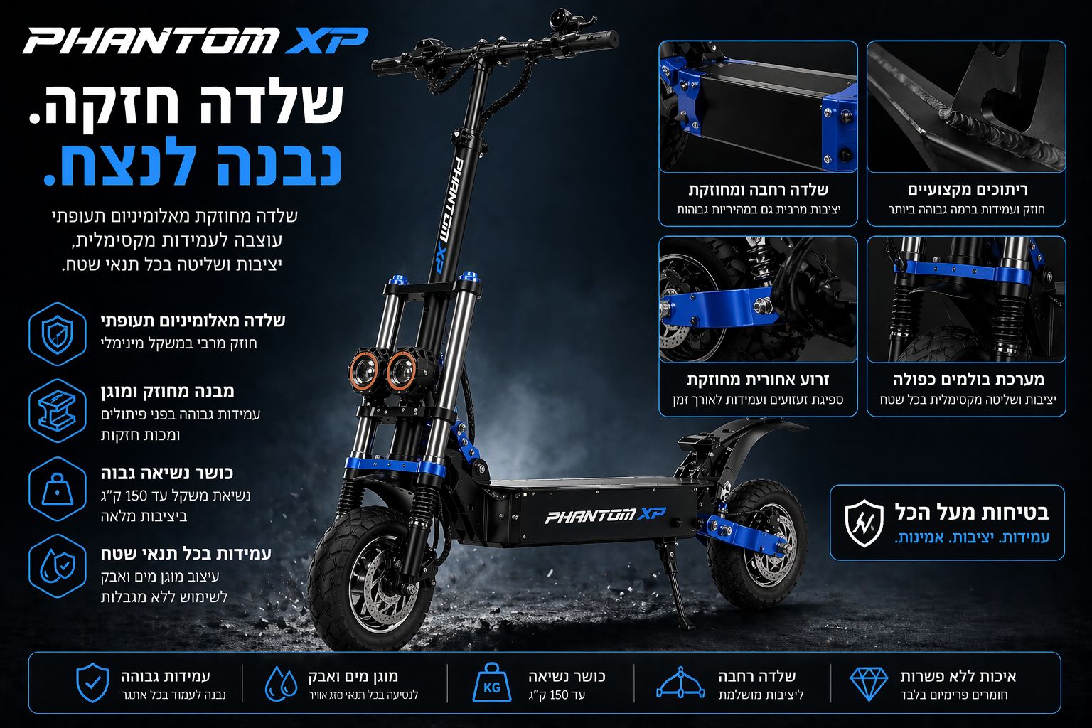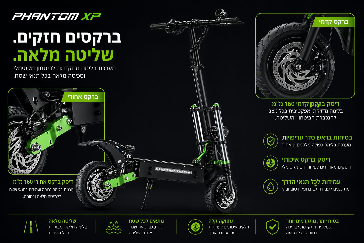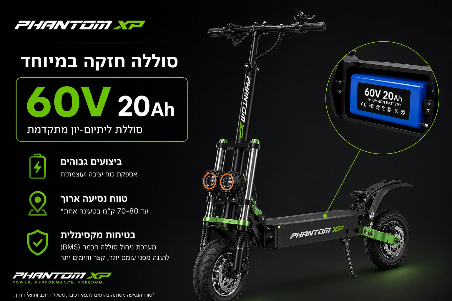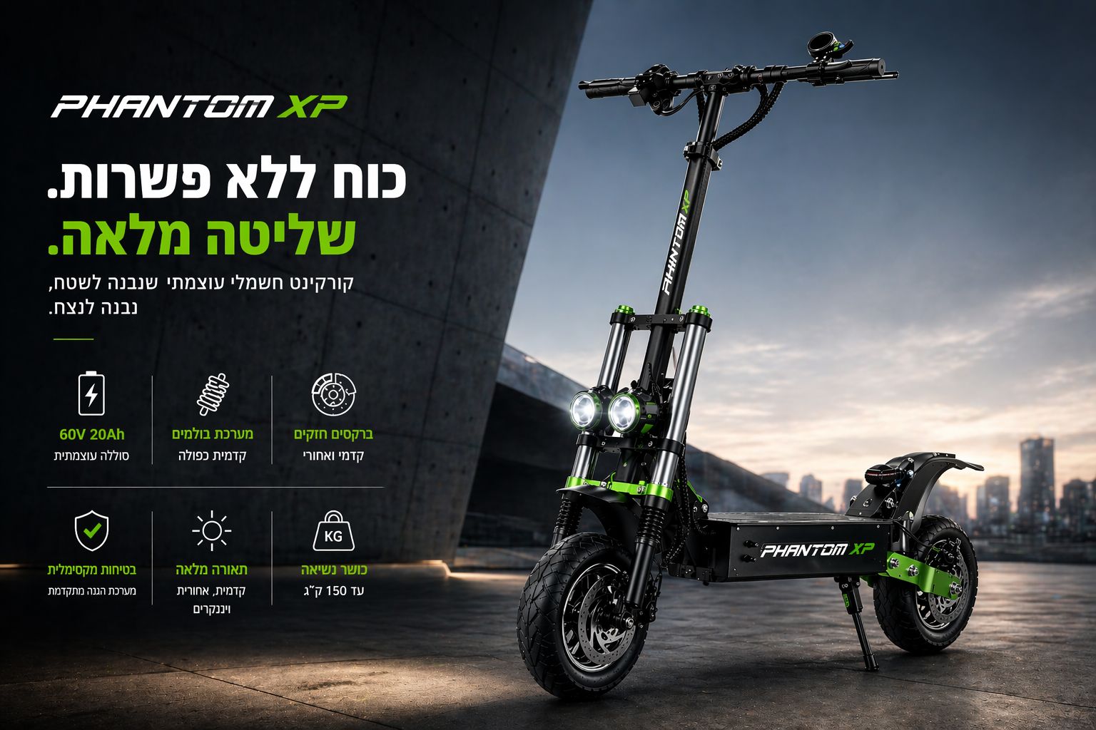 קורקינט חשמלי PHANTOM XP 60V – הכירו את – קורקינט חשמלי עוצמתי המיועד לרוכבים שמחפשים ביצועים, יציבות ובטיחות ברמה הגבוהה ביותר. שילוב מדויק בין הנדסה מתקדמת, שלדה מחוזקת וטכנולוגיה חכמה הופך אותו לבחירה האולטימטיבית לרכיבה עירונית ושטח.